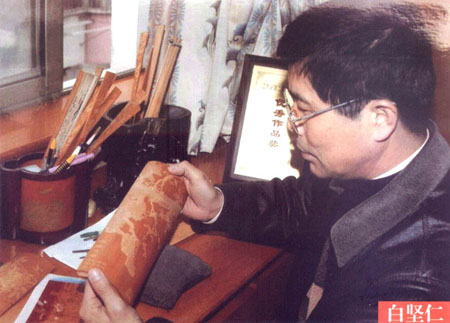 白堅仁,1956年生于江蘇常州,國家級非物質(zhì)文化遺產(chǎn)、江蘇省級傳承人、江蘇省名人,高級工藝美術師,是留青竹刻泰斗白士風之子。從小深受先父的熏陶和指點,寒來署往、夜以繼日,不僅學到了先父厚樸豁達的品格,更深得先父竹刻藝術的真諦。除繼承刻有先父創(chuàng)立的橫臺屏、筆筒等作品外,更注重作品的創(chuàng)新。多年來,經(jīng)過艱辛的探索和反復的實踐,努力吸取姐妹藝術,成功地采用了多片拼裝,配上紅木框架,制成大型的圖文并貌的作品,如帽籠、大插屏、鏡框掛件、四條屏、甚至中堂。在構圖內(nèi)容、技法變化、裝幀形式等方面,都走出了創(chuàng)新之路,使所制作品適應了現(xiàn)代人們的審美情趣和生活需求,實現(xiàn)了多年來要使留青竹刻與書畫作品同樣也能懸掛于廳堂之上的愿望。作品多次在國內(nèi)、國際展覽中獲獎,并獲得了留青竹刻史上的首位二項國家專利擁有者。