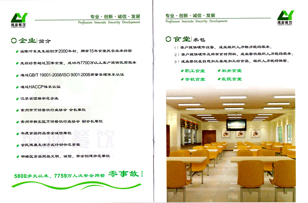 常州市成業(yè)餐飲管理有限公司位于常州市鐘樓區(qū)星港58號,是一家專業(yè)從事中小學(xué)師生營養(yǎng)餐制售及配送一體化的企業(yè),自創(chuàng)立以來,始終堅(jiān)持“專業(yè)•創(chuàng)新•誠信•發(fā)展”的經(jīng)營理念,牢固樹立“消費(fèi)者利益至上”的行業(yè)價(jià)值觀,以“社會利益和經(jīng)濟(jì)利益共同實(shí)現(xiàn)”為發(fā)展目標(biāo),深入推進(jìn)各項(xiàng)創(chuàng)建工作,積極響應(yīng),工商協(xié)同、培育品牌、信息共享、完善制度、增強(qiáng)能力,從而更好地服務(wù)于在校就餐師生。 公司董事長陳葉東先生經(jīng)過多年的自主經(jīng)營歷程,積累經(jīng)驗(yàn),勇于創(chuàng)新,積極進(jìn)取,于2009年3月籌建創(chuàng)立常州市成業(yè)餐飲管理有限公司,注冊資金518萬元整,發(fā)展至今,已經(jīng)營管理30多家中小學(xué)、企業(yè)食堂,每天為45000多人次提供優(yōu)質(zhì)放心午餐,擁有良好的經(jīng)營信譽(yù)和口碑。 為了更好的適應(yīng)常州學(xué)生營養(yǎng)餐供給模式,于2015年2月投建2000平方米中心廚房,同年8月正式投入使用,以先進(jìn)的恒溫配送模式滿足校內(nèi)無食堂的學(xué)校供餐需求。2018年5月,鑒于公司發(fā)展需求,重新投建350平方米團(tuán)餐加工及配送中心,8月正式投入生產(chǎn),力求成為常州市一流的學(xué)生營養(yǎng)餐配送企業(yè)。 基于常州公司的穩(wěn)步發(fā)展,成業(yè)并沒有滿足現(xiàn)狀,停下腳步。2017年7月以980萬注冊創(chuàng)建鹽城成業(yè)餐飲管理有限公司,為鹽城阜寧教育體系各單位提供食堂管理及師生團(tuán)膳配送服務(wù)。至2019年3月,日供餐人次已達(dá)21000多人次。 2018年7月,成業(yè)餐飲在鹽城地區(qū)相繼啟動(dòng)濱海和響水兩縣的集體用餐配送及食品原料大宗采購項(xiàng)目,當(dāng)?shù)叵嚓P(guān)政府部門對公司的發(fā)展規(guī)劃及實(shí)施進(jìn)度給予了高度評價(jià)和支持。
