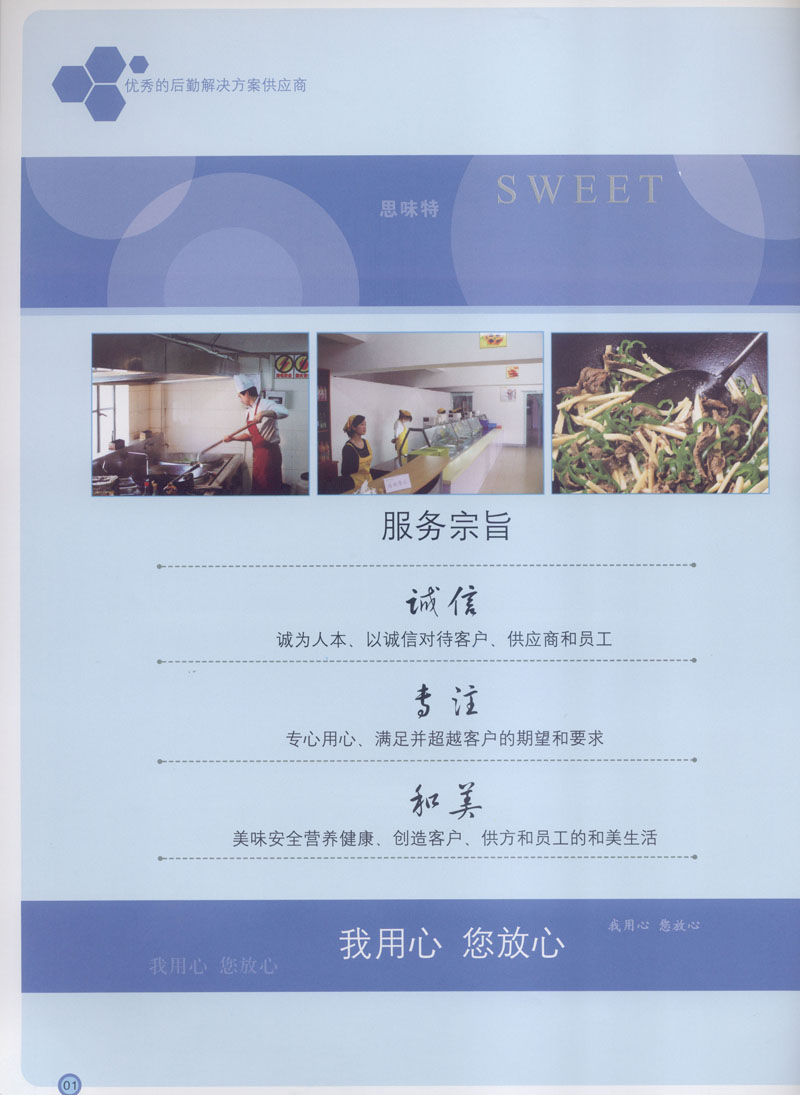 常州市思味特餐飲有限公司是一家專業(yè)從事企事業(yè)后勤服務(wù)的有限責(zé)任公司,公司從承包食堂起步,逐漸發(fā)展為經(jīng)營(yíng)團(tuán)膳承包、營(yíng)養(yǎng)送餐、生活區(qū)管理、連鎖餐廳的綜合型企業(yè)。2008年公司斥資100萬元,在常州興建了可以同時(shí)提供3000餐膳食的中央廚房,重點(diǎn)打造“和美客”后勤服務(wù)品牌,全力為企事業(yè)單位解決后勤后顧之憂。 到目前為止,我們合作成功的企事業(yè)單位超過50多家,服務(wù)人數(shù)突破15萬,合作單位包括國(guó)家機(jī)關(guān)、國(guó)有企業(yè)、三資企業(yè)、民營(yíng)企業(yè)、學(xué)校、醫(yī)院等,其中不乏國(guó)際知名品牌公司。 和美客愿為更多的國(guó)內(nèi)外企事業(yè)單位及機(jī)關(guān)團(tuán)體分憂解難,從廚房設(shè)計(jì)、菜品配送、團(tuán)膳承包、到生活區(qū)管理等提供全方位的服務(wù)。
