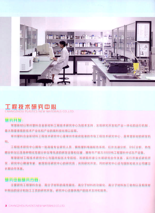 公司建設年產(chǎn)3萬噸工程塑料生產(chǎn)基地,生產(chǎn)各種阻燃ABS、耐熱ABS樹脂、工程塑料合金、功能高分子材料以及塑料助劑等產(chǎn)品。