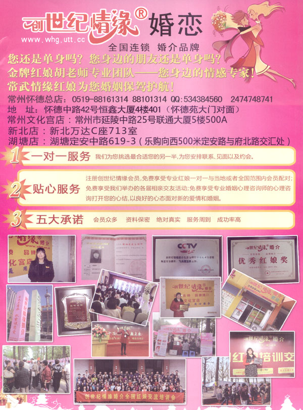 常州創(chuàng)世紀(jì)情緣婚介--是以實(shí)體婚介、活動(dòng)操作、網(wǎng)絡(luò)婚介三大結(jié)合。也是常州最大的國(guó)家商務(wù)部特許全國(guó)連鎖品牌婚介,并自主創(chuàng)建品牌:常武情緣紅娘婚戀服務(wù)中心。目前是常州地區(qū)實(shí)力最大,口碑最好的婚介品牌連鎖機(jī)構(gòu).本公司曾榮獲江蘇優(yōu)質(zhì)誠(chéng)信服務(wù)單位,常州市婚姻協(xié)會(huì)婚介理事單位,也是優(yōu)秀會(huì)員單位,也是武進(jìn)區(qū)便民服務(wù)單位,榮獲優(yōu)秀紅娘獎(jiǎng) 金牌紅娘獎(jiǎng),優(yōu)秀門店獎(jiǎng)等榮譽(yù) 。《常州晚報(bào)》 《揚(yáng)子晚報(bào)》,央視,百度,化龍巷等長(zhǎng)期合作單位。在工作中我們本著誠(chéng)實(shí)守信、為會(huì)員保密的準(zhǔn)則。 金牌紅娘胡老師專業(yè)團(tuán)隊(duì)服務(wù)宗旨是:架鵲橋,促良緣,真誠(chéng)守信,用心溝通 用心服務(wù);我們的工作態(tài)度是:熱情、周到、不卑不亢。 我們的目標(biāo):打造常州婚戀第一中高端品牌,為客戶提供最高效率、最高質(zhì)量的專業(yè)婚戀服務(wù)。我們的優(yōu)勢(shì)是:平臺(tái)大,會(huì)員多,機(jī)會(huì)多,成功率高。一對(duì)一的全程婚戀服務(wù),專業(yè)婚戀情感輔導(dǎo),量身定制征婚方案。電腦海選加人工配對(duì)相結(jié)合的先進(jìn)手段專為忙碌的城市白領(lǐng)省時(shí)高效地成就姻緣。走進(jìn)情緣讓幸福不再遙遠(yuǎn)。常武情緣紅娘為您婚姻保駕護(hù)航.給您百里挑一的機(jī)會(huì),給您幸福一生的情緣”.找對(duì)象就找金牌紅娘胡老師專業(yè)團(tuán)隊(duì)!地址:常州懷德店:懷德中路42號(hào)恒鑫大廈4樓401,(懷德苑北門對(duì)面),電話:0519-88161314,金牌紅娘胡老師:18015073344(微信同步)