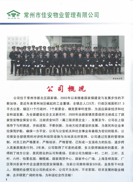 佳安物業(yè)管理有限公司位于常州市新北區(qū)薛家鎮(zhèn),2005年由薛家鎮(zhèn)黨委政府注冊(cè)成立,注冊(cè)資金50萬(wàn)元,屬于三級(jí)資質(zhì)企業(yè)。成立之初,佳安物業(yè)作為政屬事業(yè)單位,主要負(fù)責(zé)管理薛家鎮(zhèn)順園新村安置小區(qū)。隨著薛家鎮(zhèn)經(jīng)濟(jì)和人口的發(fā)展,為主動(dòng)適應(yīng)經(jīng)濟(jì)發(fā)展新常態(tài),全面深化物業(yè)綜合改革,打造具有薛家特色的物業(yè)公司,佳安物業(yè)由政府下屬的事業(yè)單位正式轉(zhuǎn)變?yōu)楠?dú)立運(yùn)營(yíng)的企業(yè),并增資到1000萬(wàn)元。 2017年6月,公司通過(guò)審核被評(píng)為“AAA”級(jí)信用企業(yè),同月,公司實(shí)施ISO9001質(zhì)量管理體系標(biāo)準(zhǔn),并于8月通過(guò)質(zhì)量體系認(rèn)證審核。2018年8月,公司通過(guò)了ISO14001環(huán)境管理體系、ohsas18001職業(yè)健康安全管理體系的認(rèn)證審核。 目前,公司主要承接小區(qū)物業(yè)服務(wù)及廠區(qū)外派保安服務(wù)、保潔服務(wù)等。現(xiàn)公司為薛家鎮(zhèn)順園一村至順園九村安置小區(qū)及奧林匹克花園、怡景名園2處商業(yè)小區(qū)提供物業(yè)服務(wù);為江南農(nóng)村商業(yè)銀行新北區(qū)所有支行、中車鐵馬、投資服務(wù)中心、華夏藝博園、薛家幼兒園、薛家小學(xué)及薛家中學(xué)等單位提供外派保安服務(wù);為薛家鎮(zhèn)中心廣場(chǎng)及松林別墅提供保安服務(wù);為華夏藝博園及投資服務(wù)中心提供保潔服務(wù)等。 在這十余年中,佳安物業(yè)與時(shí)俱進(jìn),銳意進(jìn)取,為地方建設(shè)發(fā)展注入動(dòng)力,為居民和企業(yè)安全保駕護(hù)航,尤其是在實(shí)踐中,我們積極探索,正逐步摸索出一條適合薛家城鄉(xiāng)一體化建設(shè)的社區(qū)物業(yè)管理的新路。希望通過(guò)今天的分享,和大家一起探討我們?cè)凇肮苻k分離”等方面的實(shí)踐經(jīng)驗(yàn),并在此基礎(chǔ)上為薛家的可持續(xù)發(fā)展提供可借鑒、推廣的新型物業(yè)管理之路。