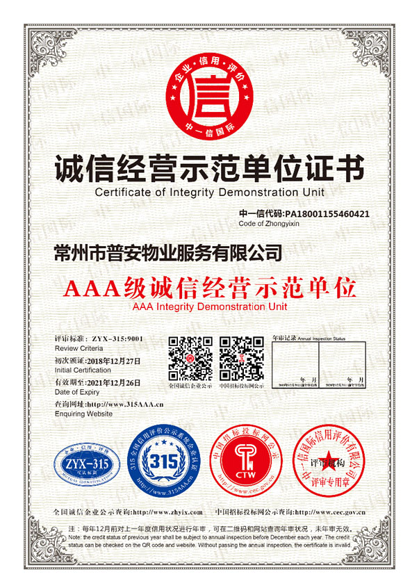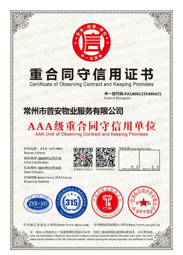 常州市普安物業(yè)服務有限公司成立于2014年6月,注冊資金500萬元人民幣,原公司名稱“常州市九合物業(yè)服務有限公司”具有國家三級物業(yè)服務資質(zhì)的物業(yè)管理服務企業(yè),公司本著“業(yè)主至上、服務第一,陽光服務、精品管理”的服務理念,精心打造具有普安物業(yè)特色的專業(yè)管理品牌。 普安物業(yè)公司現(xiàn)設總經(jīng)理辦公室、行政人事部、計劃財務部、品質(zhì)保證部、工程部、保安部、客服部、綜合部、拓展部八部一室。公司領導,管理處主任均持有國家、省、市頒發(fā)的物業(yè)管理從業(yè)資格證書,擁有一支有知識、懂技術、有多年從事物管工作經(jīng)驗的隊伍。 目前公司常州所管項目有:華都馨苑、聚豐公寓、航運家園、淹城新苑、鵬欣麗都、金禧園、瑞景華庭、光大環(huán)保企業(yè)等多個項目。 服務宗旨:業(yè)主至上、服務第一,陽光服務,精品管理。 質(zhì)量方針:以服務為企業(yè)之根本,視質(zhì)量為企業(yè)之命脈。 普安精神:誠信、團結(jié)、創(chuàng)新、奉獻。 公司愿景:打造中國最值得信賴的物業(yè)服務品牌。