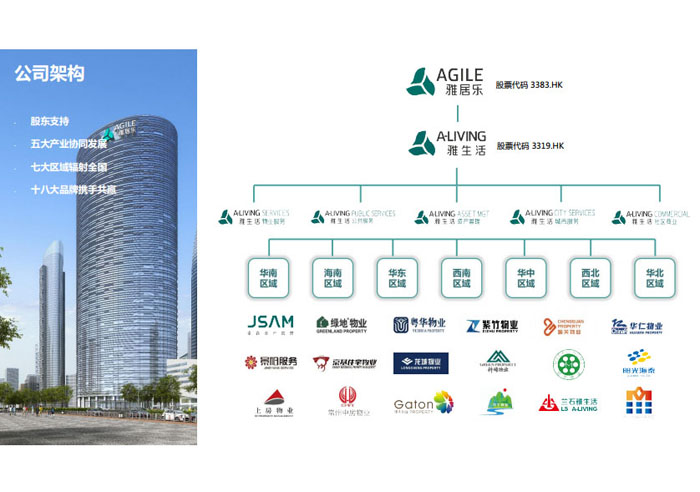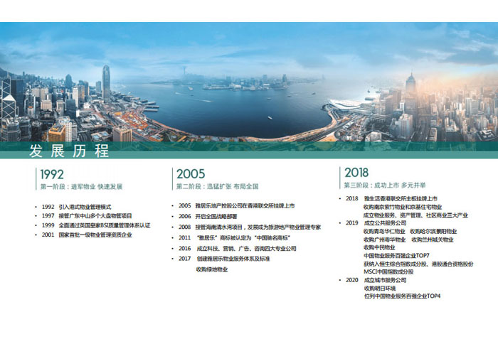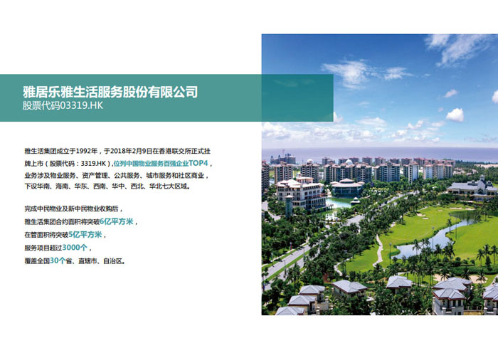 一、立足北上廣,面向全中國(guó),走向全世界 1992年,雅居樂物業(yè)開篇中山,率先引入港式物業(yè)管理模式。1997年,依托雅居樂地產(chǎn)的崛起,連續(xù)接管中山多個(gè)項(xiàng)目,成為高端大盤物業(yè)管理的領(lǐng)跑者。1999年,雅居樂物業(yè)開啟專業(yè)化發(fā)展模式,全面通過英國(guó)皇家BSI的ISO9000質(zhì)量管理體系認(rèn)證,2001年成為國(guó)家首批一級(jí)物業(yè)管理資質(zhì)企業(yè)。 2002年,隨著廣州雅居樂花園的盛大啟幕,雅居樂物業(yè)邁開向廣州進(jìn)軍的步伐。為尋求更長(zhǎng)遠(yuǎn)的發(fā)展,雅居樂積極構(gòu)思上市藍(lán)圖,2005年在香港成功上市。在深耕珠三角城市群的同時(shí),2006年雅居樂物業(yè)揮師北上,正式開啟全國(guó)部署戰(zhàn)略。2008年,接管海南清水灣項(xiàng)目,揭開旅游地產(chǎn)物業(yè)管理的新篇章。 接下來近十年里,雅居樂物業(yè)始終保持著最年輕的成長(zhǎng)姿態(tài),依托“管理數(shù)字化、服務(wù)專業(yè)化、流程標(biāo)準(zhǔn)化和操作機(jī)械化”的發(fā)展戰(zhàn)略,雅居樂物業(yè)榮膺2018中國(guó)物業(yè)服務(wù)百?gòu)?qiáng)企業(yè)第11名,2018年中國(guó)物業(yè)服務(wù)百?gòu)?qiáng)企業(yè)成長(zhǎng)性第二名、2018年中國(guó)物業(yè)服務(wù)百?gòu)?qiáng)服務(wù)質(zhì)量領(lǐng)先企業(yè)、2018年中國(guó)物業(yè)服務(wù)百?gòu)?qiáng)滿意度領(lǐng)先企業(yè)、2018中國(guó)物業(yè)服務(wù)百?gòu)?qiáng)經(jīng)營(yíng)績(jī)效領(lǐng)先企業(yè)、旅游地產(chǎn)物業(yè)管理領(lǐng)先品牌、2018年中國(guó)辦公物業(yè)管理優(yōu)秀企業(yè)(綠地物業(yè))、2017中國(guó)物業(yè)管理企業(yè)品牌價(jià)值第12名、2017中國(guó)物業(yè)管理企業(yè)綜合實(shí)力第12名、中國(guó)藍(lán)籌物業(yè)企業(yè)、《旅游地產(chǎn)物業(yè)管理服務(wù)標(biāo)準(zhǔn)》(團(tuán)體標(biāo)準(zhǔn))起草工作等多項(xiàng)殊榮。 目前,雅生活集團(tuán)已形成廣州、中山、深圳、南京、上海、西安、成都、海南、云南、北京、鄭州、南寧、沈陽、武漢、馬來西亞十五大城市公司全面發(fā)展的蓬勃態(tài)勢(shì)。截止2017年12月31日,雅生活集團(tuán)管理范圍覆蓋全國(guó)逾69座城市與地區(qū),服務(wù)類型涵蓋主流住宅、高端豪宅、旅游地產(chǎn)、商業(yè)、寫字樓等多種業(yè)態(tài),合約總建筑面積為12610萬平方米,擁有200多個(gè)項(xiàng)目,服務(wù)業(yè)主逾100萬人。 2017年6月,雅生活集團(tuán)收購(gòu)綠地物業(yè)100%股權(quán),并與綠地集團(tuán)簽署戰(zhàn)略合作協(xié)議,8月,綠地集團(tuán)投資10億元獲得雅生活集團(tuán)20%股權(quán)。未來,雅生活集團(tuán)將實(shí)施“雅居樂物業(yè)”與“綠地物業(yè)”雙品牌驅(qū)動(dòng)戰(zhàn)略,還將尋求在A股上市,力爭(zhēng)打造中國(guó)物業(yè)“A+H”第一股。