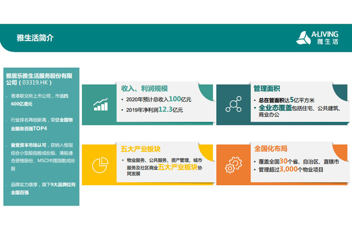 二、全面市場(chǎng)化運(yùn)作,加速增值服務(wù)發(fā)展 隨著越來越多物業(yè)服務(wù)企業(yè)走向資本市場(chǎng),物業(yè)行業(yè)之間的市場(chǎng)競(jìng)爭(zhēng)也愈演愈烈。行業(yè)集中度不斷提升,消費(fèi)者的需求日愈多元化,面對(duì)這樣的發(fā)展浪潮,雅生活集團(tuán)勇敢跳出原有只依靠承接自建物業(yè)的經(jīng)營(yíng)模式,開始實(shí)施全面市場(chǎng)化運(yùn)作,通過市場(chǎng)拓展、兼并收購(gòu)尋求規(guī)模的迅速擴(kuò)大。 目前,雅生活集團(tuán)每年市場(chǎng)拓展目標(biāo)2000萬平方米,承接業(yè)態(tài)除主流住宅物業(yè)以外,還包括商業(yè)、寫字樓、旅游地產(chǎn)及酒店等非住宅物業(yè)管理業(yè)務(wù)。憑借26年的高品質(zhì)物業(yè)服務(wù)經(jīng)驗(yàn)和良好的品牌形象,雅生活集團(tuán)迅速在拓展市場(chǎng)成為后起之秀。2020年,雅生活集團(tuán)的市場(chǎng)拓展產(chǎn)值將達(dá)到20億。 在兼收并購(gòu)方面,雅生活集團(tuán)精準(zhǔn)出擊,成功收購(gòu)綠地物業(yè)100%股權(quán),這也成為物業(yè)管理行業(yè)的一大盛事。接下來,雅生活集團(tuán)將繼續(xù)整合最優(yōu)質(zhì)資源,迅速做大做強(qiáng)。 在多種經(jīng)營(yíng)方面,雅生活集團(tuán)以業(yè)主需求為出發(fā)點(diǎn),對(duì)標(biāo)優(yōu)秀同行,因地制宜,創(chuàng)新發(fā)展,積極開拓多種增值服務(wù),讓業(yè)主真正體會(huì)“驚喜+感動(dòng)”。