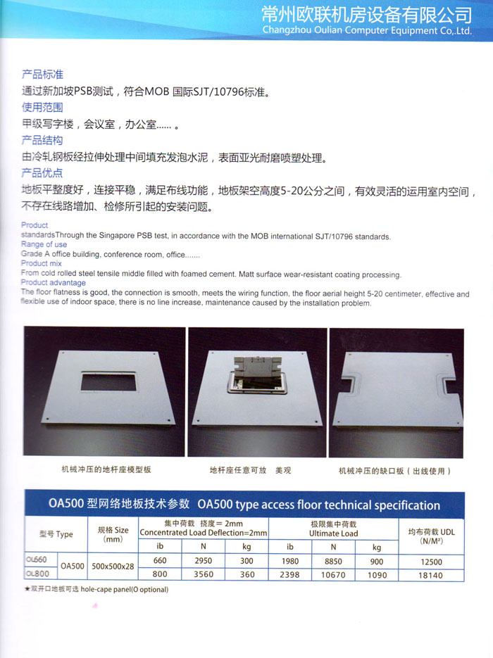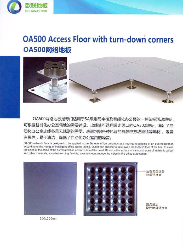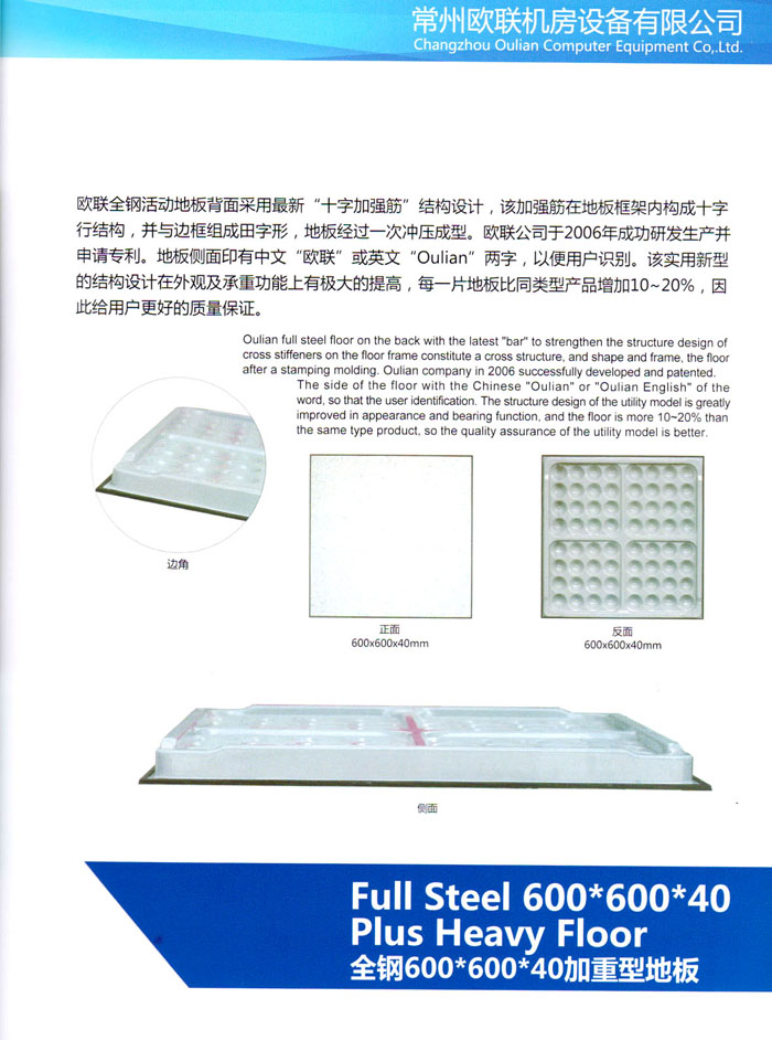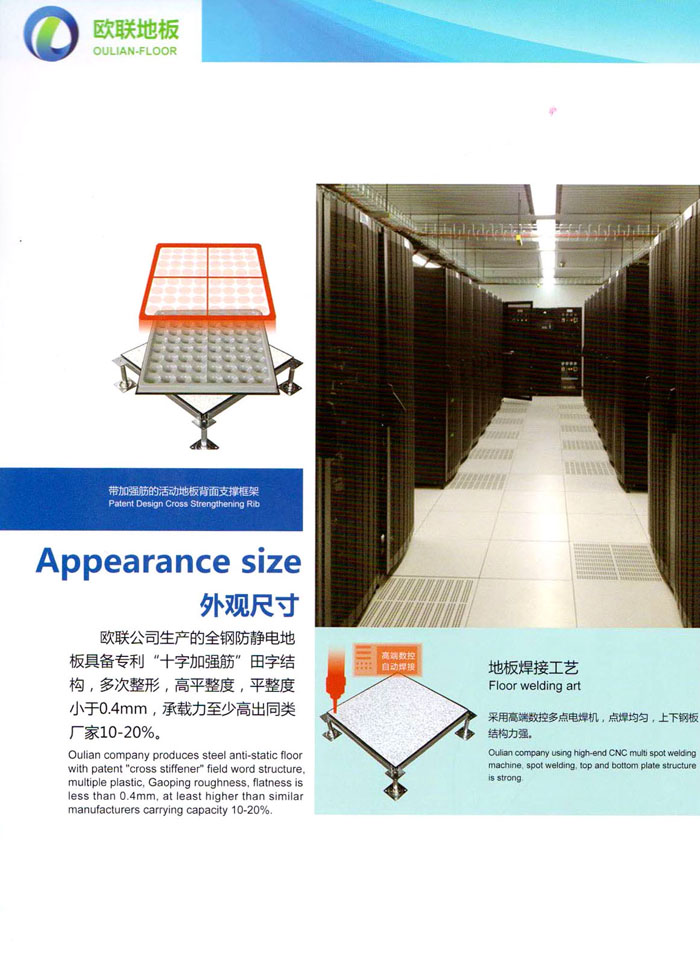防靜電高架活動(dòng)地板、全鋼地板、陶瓷地板是計(jì)算機(jī)行業(yè)發(fā)展起來(lái)的新型鋪地材料,隔離了潮氣、靜電灰塵,最重要的是解決了綜合布線問(wèn)題,無(wú)需預(yù)埋管線,可隨時(shí)拆卸、搬移,保證了資訊設(shè)備完整的優(yōu)點(diǎn),適應(yīng)了智能化樓宇中信息自動(dòng)化技術(shù)對(duì)所處環(huán)境的特定要求,避免了廣大客戶的雙重投資,使現(xiàn)代化辦公程度更加高效,辦公場(chǎng)所更加舒適。 “歐聯(lián)”系列全鋼地板,符合國(guó)家安全要求,種類完備多樣,其中防靜電陶瓷地板、硫酸鈣地板等除具有普通瓷質(zhì)的裝飾和實(shí)用性外,其耐磨、防水、防火功能優(yōu)于其它同類產(chǎn)品,防靜電系列地板,能切合不同客戶的要求,其靈活的配置,深受客戶歡迎,不同材質(zhì)的地板結(jié)構(gòu)使設(shè)計(jì)師的設(shè)計(jì)空間比傳統(tǒng)的更加廣闊自由和善變。 公司大力發(fā)展國(guó)內(nèi)外銷售業(yè)務(wù),多次中標(biāo)國(guó)內(nèi)重點(diǎn)工程 ,例:哈爾濱醫(yī)科大學(xué)、山東大學(xué)、上海普通機(jī)場(chǎng)等。 公司將一如既往開發(fā)和制造一流的產(chǎn)品,愿與廣大有識(shí)之士合作發(fā)展,共創(chuàng)美好未來(lái)。