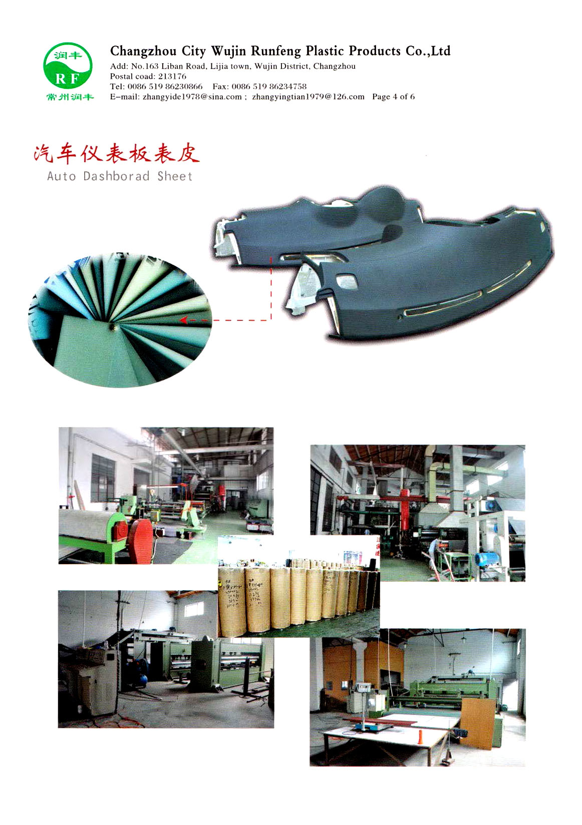 常州市武進(jìn)潤(rùn)豐塑料制品有限公司地處風(fēng)景美麗經(jīng)濟(jì)發(fā)達(dá)的長(zhǎng)江三角洲常州市東郊禮嘉鎮(zhèn),公司占地面積約8000平方米,且地理位置優(yōu)越,是中外客商常涉之地。 本公司專業(yè)生產(chǎn)汽車儀板軟化表皮、PVC門護(hù)板表皮、PVC復(fù)合制品、壓延薄膜制品,(塑料制品除醫(yī)用塑料制品),車輛零部件,機(jī)械電器零部件,電子元件,沖壓件制造,加工無妨制品,玻纖氈(GFP板),麻氈板等。本公司的產(chǎn)品在國(guó)內(nèi)一線乘用車上廣泛使用。產(chǎn)品通過國(guó)家汽車質(zhì)量監(jiān)督檢驗(yàn)中心檢測(cè),并取得了各種證書,如亞瑟國(guó)際認(rèn)證;ISO/TS1694:2009等。 本公司技術(shù)力量雄厚,生產(chǎn)設(shè)備先進(jìn)。多年來,建立了較完善的質(zhì)量管理體系,以先進(jìn)的檢測(cè)技術(shù),優(yōu)質(zhì)的服務(wù)態(tài)度,向客戶提供最優(yōu)秀的產(chǎn)品,在同行中享有良好的聲譽(yù)。 歡迎新老客戶來公司指導(dǎo),洽談,合作。
