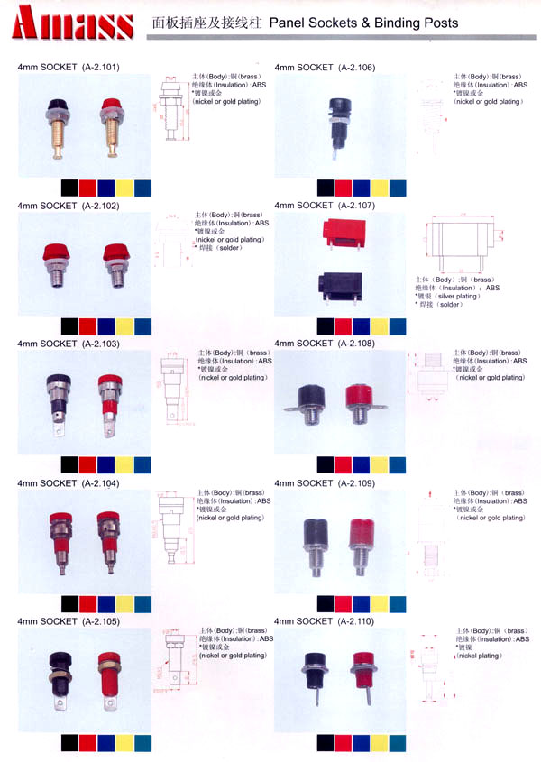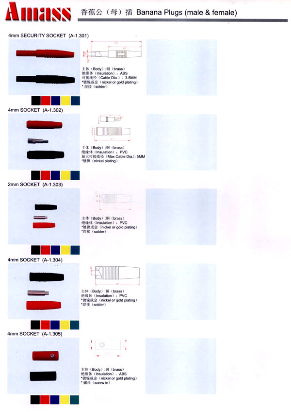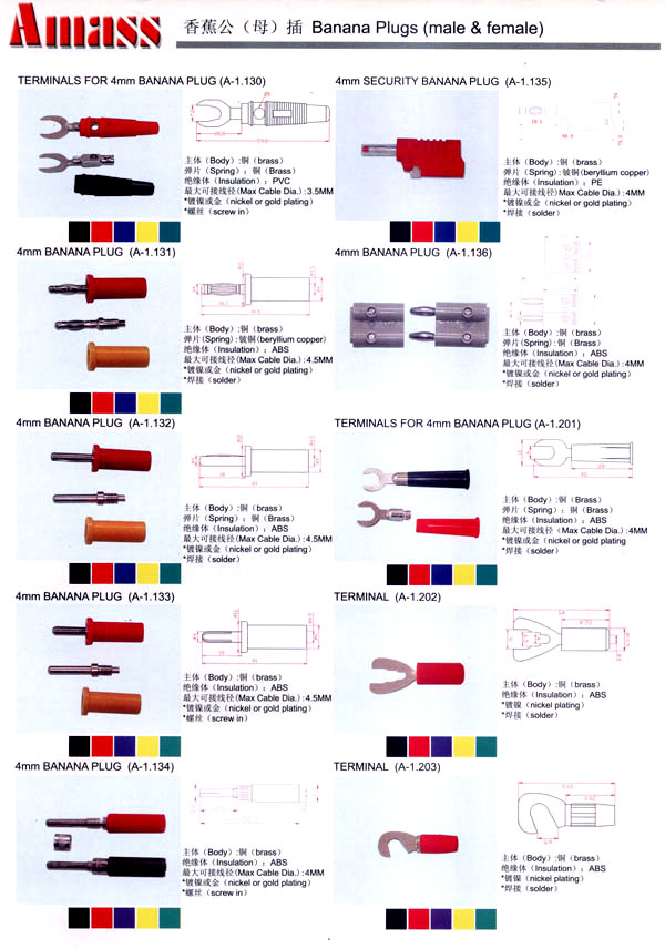 本公司專業(yè)生產(chǎn)各類香蕉插頭,香蕉插座,接線柱,電瓶夾,鱷魚夾,測試導(dǎo)線,測試筆等。產(chǎn)品分2mm/2.5mm/3mm/3.5mm/4mm五大系列,百余種款式, 各種香蕉插廣泛用于儀器、儀表、電力測試、教學(xué)、玩具,視聽設(shè)備、醫(yī)療儀器,保健產(chǎn)品等領(lǐng)域。公司技術(shù)力量雄厚,生產(chǎn)工藝先進(jìn),產(chǎn)品遠(yuǎn)銷港、臺(tái)、歐美,并與飛利浦等國際品牌配套。公司本著精益求精的理念,歡迎新老客戶光臨。 我們擁有資深的工程師和豐富的電子產(chǎn)品銷售經(jīng)驗(yàn),專業(yè)生產(chǎn)各類電子接插件產(chǎn)品。 香蕉插頭,香蕉插座,電瓶夾,鱷魚夾等品種齊全、 質(zhì)量可靠,致力服務(wù)于通訊、數(shù)據(jù)通信、消費(fèi)類電子產(chǎn)品、計(jì)算機(jī)和計(jì)算機(jī)外圍設(shè)備以及工業(yè)應(yīng)用等領(lǐng)域,能給客戶提供全面采購解決方案。 我們秉承穩(wěn)健作風(fēng)、誠實(shí)經(jīng)營、合理價(jià)格、完善服務(wù)的宗旨,在全體客戶的支持下,公司不斷創(chuàng)新進(jìn)取,業(yè)績蒸蒸日上,已與數(shù)十家電子零件制造商及其分支機(jī)構(gòu)建立密切合作關(guān)系,在國內(nèi)擁有數(shù)百家固定客戶。
