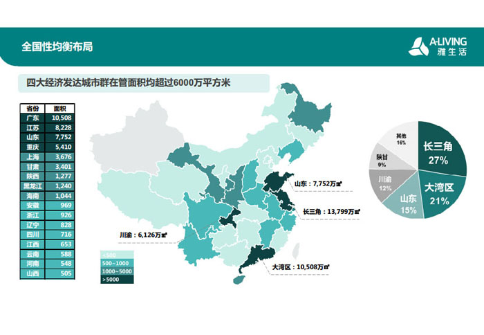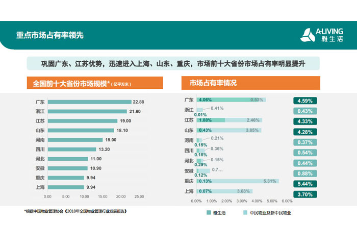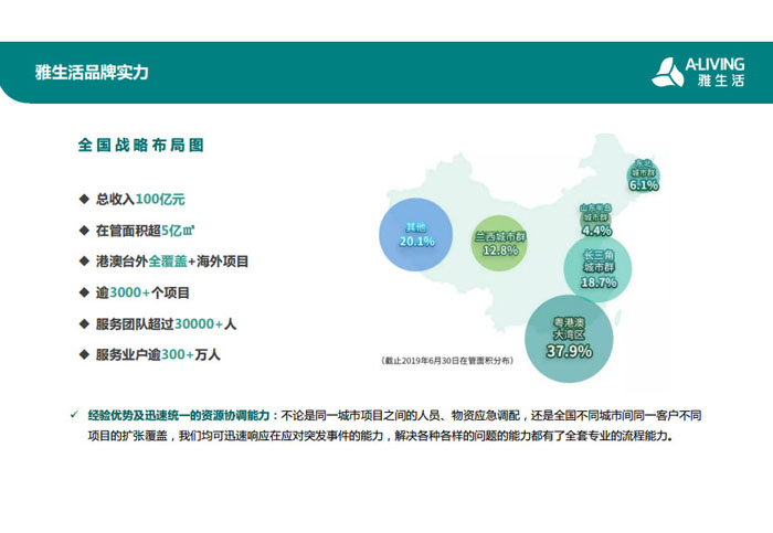 一、立足北上廣,面向全中國(guó),走向全世界 1992年,雅居樂物業(yè)開篇中山,率先引入港式物業(yè)管理模式。1997年,依托雅居樂地產(chǎn)的崛起,連續(xù)接管中山多個(gè)項(xiàng)目,成為高端大盤物業(yè)管理的領(lǐng)跑者。1999年,雅居樂物業(yè)開啟專業(yè)化發(fā)展模式,全面通過英國(guó)皇家BSI的ISO9000質(zhì)量管理體系認(rèn)證,2001年成為國(guó)家首批一級(jí)物業(yè)管理資質(zhì)企業(yè)。 2002年,隨著廣州雅居樂花園的盛大啟幕,雅居樂物業(yè)邁開向廣州進(jìn)軍的步伐。為尋求更長(zhǎng)遠(yuǎn)的發(fā)展,雅居樂積極構(gòu)思上市藍(lán)圖,2005年在香港成功上市。在深耕珠三角城市群的同時(shí),2006年雅居樂物業(yè)揮師北上,正式開啟全國(guó)部署戰(zhàn)略。2008年,接管海南清水灣項(xiàng)目,揭開旅游地產(chǎn)物業(yè)管理的新篇章。 接下來近十年里,雅居樂物業(yè)始終保持著最年輕的成長(zhǎng)姿態(tài),依托“管理數(shù)字化、服務(wù)專業(yè)化、流程標(biāo)準(zhǔn)化和操作機(jī)械化”的發(fā)展戰(zhàn)略,雅居樂物業(yè)榮膺2018中國(guó)物業(yè)服務(wù)百?gòu)?qiáng)企業(yè)第11名,2018年中國(guó)物業(yè)服務(wù)百?gòu)?qiáng)企業(yè)成長(zhǎng)性第二名、2018年中國(guó)物業(yè)服務(wù)百?gòu)?qiáng)服務(wù)質(zhì)量領(lǐng)先企業(yè)、2018年中國(guó)物業(yè)服務(wù)百?gòu)?qiáng)滿意度領(lǐng)先企業(yè)、2018中國(guó)物業(yè)服務(wù)百?gòu)?qiáng)經(jīng)營(yíng)績(jī)效領(lǐng)先企業(yè)、旅游地產(chǎn)物業(yè)管理領(lǐng)先品牌、2018年中國(guó)辦公物業(yè)管理優(yōu)秀企業(yè)(綠地物業(yè))、2017中國(guó)物業(yè)管理企業(yè)品牌價(jià)值第12名、2017中國(guó)物業(yè)管理企業(yè)綜合實(shí)力第12名、中國(guó)藍(lán)籌物業(yè)企業(yè)、《旅游地產(chǎn)物業(yè)管理服務(wù)標(biāo)準(zhǔn)》(團(tuán)體標(biāo)準(zhǔn))起草工作等多項(xiàng)殊榮。 目前,雅生活集團(tuán)已形成廣州、中山、深圳、南京、上海、西安、成都、海南、云南、北京、鄭州、南寧、沈陽、武漢、馬來西亞十五大城市公司全面發(fā)展的蓬勃態(tài)勢(shì)。截止2017年12月31日,雅生活集團(tuán)管理范圍覆蓋全國(guó)逾69座城市與地區(qū),服務(wù)類型涵蓋主流住宅、高端豪宅、旅游地產(chǎn)、商業(yè)、寫字樓等多種業(yè)態(tài),合約總建筑面積為12610萬平方米,擁有200多個(gè)項(xiàng)目,服務(wù)業(yè)主逾100萬人。 2017年6月,雅生活集團(tuán)收購(gòu)綠地物業(yè)100%股權(quán),并與綠地集團(tuán)簽署戰(zhàn)略合作協(xié)議,8月,綠地集團(tuán)投資10億元獲得雅生活集團(tuán)20%股權(quán)。未來,雅生活集團(tuán)將實(shí)施“雅居樂物業(yè)”與“綠地物業(yè)”雙品牌驅(qū)動(dòng)戰(zhàn)略,還將尋求在A股上市,力爭(zhēng)打造中國(guó)物業(yè)“A+H”第一股。