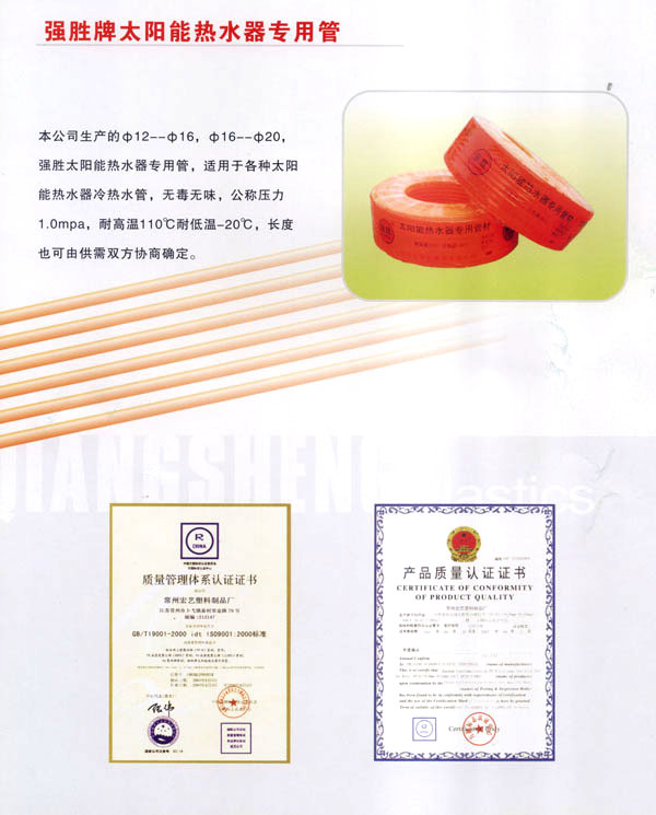 本公司是改革開放初期成立的獨(dú)資私營企業(yè)。二十余年來,本廠在尊重 科學(xué)、尊重人才、加強(qiáng)技改、狠抓管理的基礎(chǔ)上使企業(yè)不斷地發(fā)展壯大。目前,本廠擁有22條先進(jìn)水平地單螺桿擠出機(jī)生產(chǎn)線,2條生產(chǎn)大口徑PP管地生產(chǎn)線,8臺(tái)電腦注塑機(jī),以及全套精密地檢測設(shè)備和高素質(zhì)地檢測人員,確保了產(chǎn)品質(zhì)量。年生產(chǎn)能力達(dá)6000噸,成為各種塑料管道地專業(yè)生產(chǎn)廠家。 我們的主要產(chǎn)品有: 給水用三型聚丙烯(PP-R)管材、管件;PE高密度聚乙烯(HDPE)管材;PE低密度聚乙烯(LLDPE)管材;PP聚乙烯管材;強(qiáng)勝牌太陽能熱水器專用管。 產(chǎn)品廣泛用于城鄉(xiāng)水改、郵電通信、高壓供電、市政改造、路燈管理、鑿井挖泥、航道疏竣、選礦尾砂填充、環(huán)保、化工、輕工等行業(yè)。 本廠生產(chǎn)的各類管材及管件,吸收國內(nèi)外同類產(chǎn)品的精華,設(shè)計(jì)先進(jìn),結(jié)構(gòu)合理,選料科學(xué),質(zhì)量執(zhí)行國家標(biāo)準(zhǔn),產(chǎn)品歷年經(jīng)國家塑料制品質(zhì)量監(jiān)督檢驗(yàn)中心檢驗(yàn)合格。 我們始終秉承“以人品塑造產(chǎn)品”的理念,以科學(xué)提升品質(zhì)、與時(shí)俱進(jìn),以強(qiáng)大的研發(fā)能力,高質(zhì)量的提供新型的環(huán)保產(chǎn)品,回報(bào)社會(huì)各界的支持!
