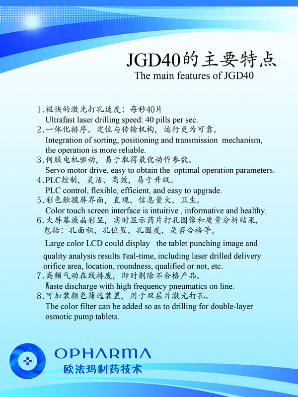 常州歐法瑪制藥技術(shù)有限公司位于長江三角洲黃金腹地——常州。地理位置優(yōu)越、交通便捷,由鐵路、公路、水路、民航形成了一張立體交叉的交通網(wǎng)絡(luò)。 公司創(chuàng)建于2013年,是一家集研發(fā)、生產(chǎn)和銷售為一體,專業(yè)從事高速激光打孔機、滲透泵制劑研發(fā)、生產(chǎn)和銷售。目前公司擁有員工20人,科技研發(fā)和技術(shù)人員占員工總數(shù)80%以上,其中本科以上學(xué)歷占80%以上。 公司始建以來,以前瞻的科學(xué)規(guī)劃,通過自主研發(fā),解決了高速激光打孔機諸多的世界難題,使之達到40片/秒以上且精確打孔的國際領(lǐng)先水平;同時開發(fā)廢片自動識別、剔除功能,以滿足客戶的實際所需。公司與瑞士等國家研究機構(gòu)的科技合作,以高速激光打孔機為基礎(chǔ),建設(shè)了滲透泵制劑研發(fā)和中試生產(chǎn)車間,開發(fā)了多種藥物的滲透泵制劑,形成了從關(guān)鍵設(shè)備研制,新制劑開發(fā)、工藝配套,到批量生產(chǎn)測試的滲透泵制劑開發(fā)全過程技術(shù)團隊和研究設(shè)施。公司瞄準(zhǔn)現(xiàn)代新型釋藥系統(tǒng),吸收國內(nèi)外高端人才,努力開拓控緩釋技術(shù)、靶向給藥技術(shù)及智能給藥技術(shù)。 2013年公司被評為黑馬大賽“創(chuàng)業(yè)組50強”、“領(lǐng)軍人才創(chuàng)業(yè)重點企業(yè)”;2014公司通過了IS09001-2008質(zhì)量管理體系認(rèn)證、CE認(rèn)證、江蘇省質(zhì)量信得過企業(yè)。