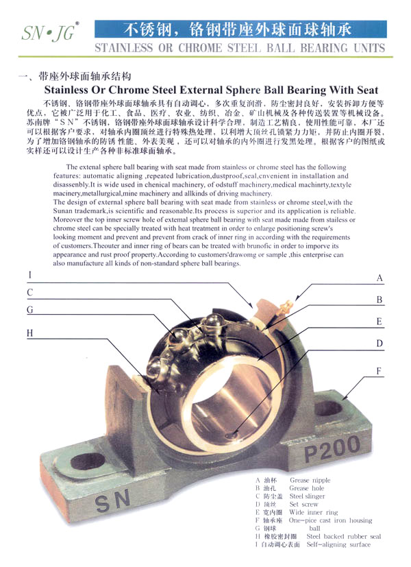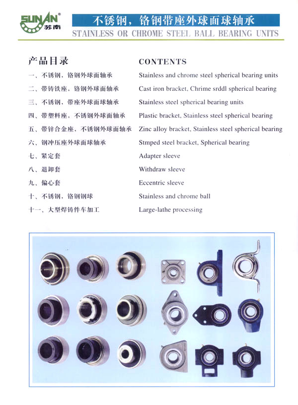 常州市武進(jìn)蘇南軸承有限公司是生產(chǎn)鋼球及帶座外球面軸承的專業(yè)工廠,主要生產(chǎn)蘇南牌“SN”不銹鋼球、鉻鋼鋼球,以及不銹鋼、鉻鋼UC、UCX、UK、HC、SB、SA、SER、UOOO、KOOO及其它非標(biāo)系列各類帶座外球面軸承、偏心套、緊定套等產(chǎn)品。本廠生產(chǎn)規(guī)格有軸承鋼球0.5-150m/m,碳鋼球0.5-150m/m,不銹鋼球0.8-50m/m,同時(shí)定做各種特殊規(guī)格的不銹鋼球、銅球、陶瓷球等。為廣大用戶提供品質(zhì)優(yōu)良,規(guī)格齊全,價(jià)格合理的各種鋼球。