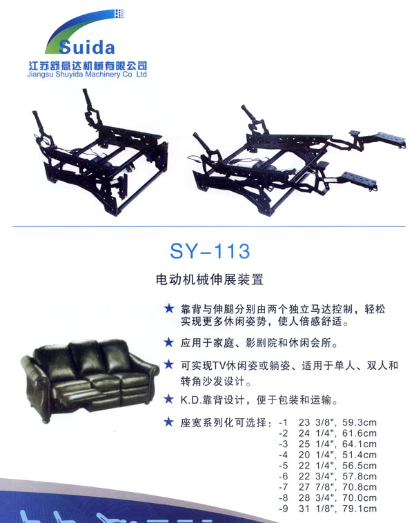 江蘇舒意達機械有限公司是一家集研發(fā)設(shè)計,生產(chǎn)制造及銷售的專業(yè)家具五金企業(yè)。公司成立于2006年,座落于風(fēng)景秀麗的江南常州,交通運輸?shù)锰飒毢,為海?nèi)外客商的來往交流,洽談和供貨提供了諸多便利,公司占地面積28000平方米,生產(chǎn)廠房面積18000平方米,獨立的辦公樓,擁有良好的工作環(huán)境。 我們的經(jīng)營思理念:堅持以人為本,科技為先,用先進的設(shè)備,好的工藝流程制造一流的產(chǎn)品。 我們的口號:保證以優(yōu)秀的品質(zhì)服務(wù)于客人,我們的目標(biāo):研發(fā)更多舒適的產(chǎn)品,帶來生活的享受。 公司誠邀海內(nèi)外客商前來指導(dǎo)洽談,攜手共進,共造雙贏。