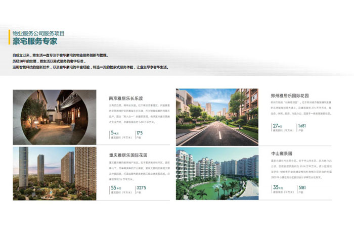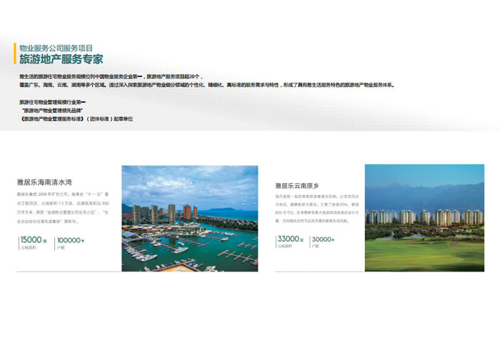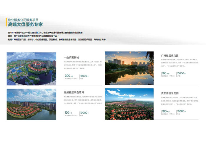 一、立足北上廣,面向全中國,走向全世界 1992年,雅居樂物業(yè)開篇中山,率先引入港式物業(yè)管理模式。1997年,依托雅居樂地產(chǎn)的崛起,連續(xù)接管中山多個項(xiàng)目,成為高端大盤物業(yè)管理的領(lǐng)跑者。1999年,雅居樂物業(yè)開啟專業(yè)化發(fā)展模式,全面通過英國皇家BSI的ISO9000質(zhì)量管理體系認(rèn)證,2001年成為國家首批一級物業(yè)管理資質(zhì)企業(yè)。 2002年,隨著廣州雅居樂花園的盛大啟幕,雅居樂物業(yè)邁開向廣州進(jìn)軍的步伐。為尋求更長遠(yuǎn)的發(fā)展,雅居樂積極構(gòu)思上市藍(lán)圖,2005年在香港成功上市。在深耕珠三角城市群的同時,2006年雅居樂物業(yè)揮師北上,正式開啟全國部署戰(zhàn)略。2008年,接管海南清水灣項(xiàng)目,揭開旅游地產(chǎn)物業(yè)管理的新篇章。 接下來近十年里,雅居樂物業(yè)始終保持著最年輕的成長姿態(tài),依托“管理數(shù)字化、服務(wù)專業(yè)化、流程標(biāo)準(zhǔn)化和操作機(jī)械化”的發(fā)展戰(zhàn)略,雅居樂物業(yè)榮膺2018中國物業(yè)服務(wù)百強(qiáng)企業(yè)第11名,2018年中國物業(yè)服務(wù)百強(qiáng)企業(yè)成長性第二名、2018年中國物業(yè)服務(wù)百強(qiáng)服務(wù)質(zhì)量領(lǐng)先企業(yè)、2018年中國物業(yè)服務(wù)百強(qiáng)滿意度領(lǐng)先企業(yè)、2018中國物業(yè)服務(wù)百強(qiáng)經(jīng)營績效領(lǐng)先企業(yè)、旅游地產(chǎn)物業(yè)管理領(lǐng)先品牌、2018年中國辦公物業(yè)管理優(yōu)秀企業(yè)(綠地物業(yè))、2017中國物業(yè)管理企業(yè)品牌價值第12名、2017中國物業(yè)管理企業(yè)綜合實(shí)力第12名、中國藍(lán)籌物業(yè)企業(yè)、《旅游地產(chǎn)物業(yè)管理服務(wù)標(biāo)準(zhǔn)》(團(tuán)體標(biāo)準(zhǔn))起草工作等多項(xiàng)殊榮。 目前,雅生活集團(tuán)已形成廣州、中山、深圳、南京、上海、西安、成都、海南、云南、北京、鄭州、南寧、沈陽、武漢、馬來西亞十五大城市公司全面發(fā)展的蓬勃態(tài)勢。截止2017年12月31日,雅生活集團(tuán)管理范圍覆蓋全國逾69座城市與地區(qū),服務(wù)類型涵蓋主流住宅、高端豪宅、旅游地產(chǎn)、商業(yè)、寫字樓等多種業(yè)態(tài),合約總建筑面積為12610萬平方米,擁有200多個項(xiàng)目,服務(wù)業(yè)主逾100萬人。 2017年6月,雅生活集團(tuán)收購綠地物業(yè)100%股權(quán),并與綠地集團(tuán)簽署戰(zhàn)略合作協(xié)議,8月,綠地集團(tuán)投資10億元獲得雅生活集團(tuán)20%股權(quán)。未來,雅生活集團(tuán)將實(shí)施“雅居樂物業(yè)”與“綠地物業(yè)”雙品牌驅(qū)動戰(zhàn)略,還將尋求在A股上市,力爭打造中國物業(yè)“A+H”第一股。