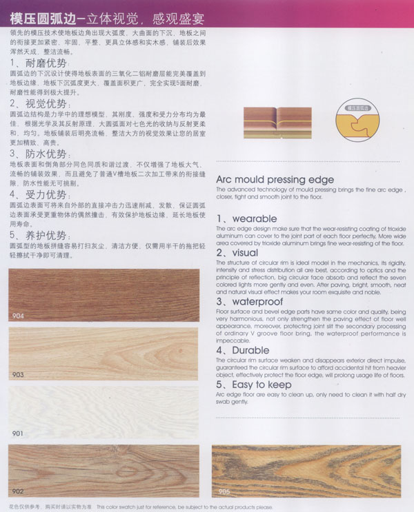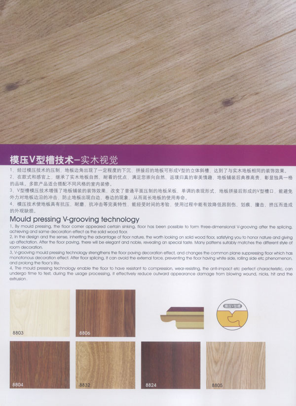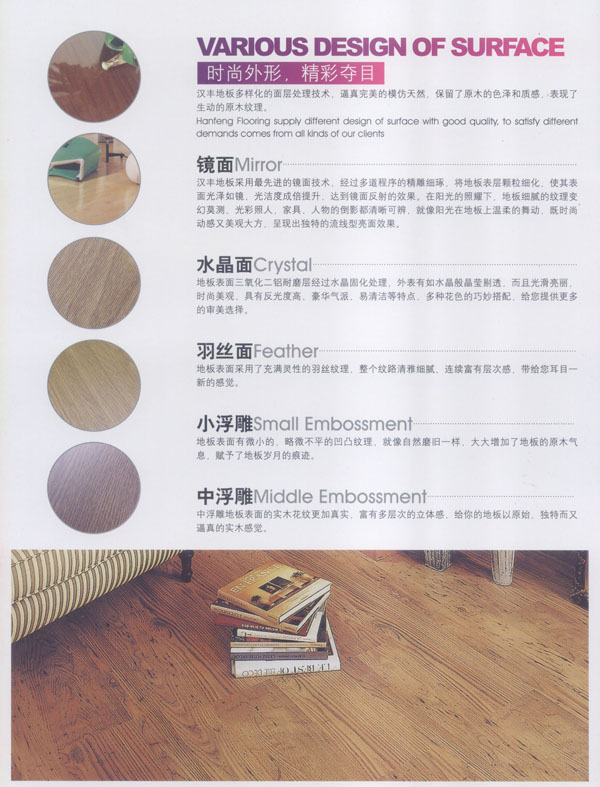 漢豐地板以奉獻(xiàn)生活中最完美的地板為發(fā)展目標(biāo),時(shí)尚流行的設(shè)計(jì)風(fēng)格和多樣化的產(chǎn)品類型,贏得了市場(chǎng)的廣泛贊譽(yù)和肯定。產(chǎn)品嚴(yán)格按照歐洲標(biāo)準(zhǔn)檢測(cè)強(qiáng)化木地板的各項(xiàng)性能指標(biāo).達(dá)到百分百的國(guó)際技術(shù)標(biāo)準(zhǔn),確保了每一塊地板都有著上乘品質(zhì),是綠色環(huán)保的好地板。并先后通過了Isc)9001國(guó)際質(zhì)量管理體系認(rèn)證,IS014001國(guó)際環(huán)境管理體系認(rèn)證.中國(guó)環(huán)境標(biāo)志產(chǎn)品認(rèn)證,深得用戶的一致好評(píng),是寫字樓、商場(chǎng)、大型超市、學(xué)校、建筑樓宇、娛樂場(chǎng)所、家用私宅等鋪裝的首選地板。