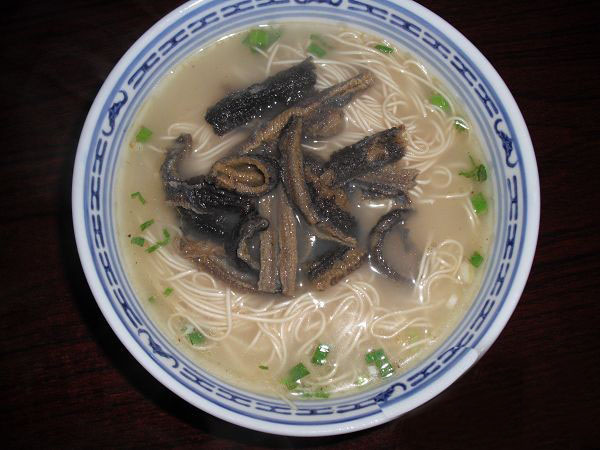 常州新北區(qū)孟河公陽小吃店從事鱔絲面23年,經(jīng)營面積100平方米,黃鱔全是野生,面湯采用高湯制作(鱔魚湯),下面的時候先用開水把黃鱔燙熟,然后用竹刀批下二條黃鱔肉,除去骨頭肚腸,切成段后入油鍋里炸酥,再用白湯烹制成為面澆頭。而面湯是用鱔魚骨頭、豬骨等用大鍋猛火煮上三、四個鐘頭,成為一鍋濃濃的白湯,再進(jìn)行調(diào)味,吃到嘴里全身舒坦。