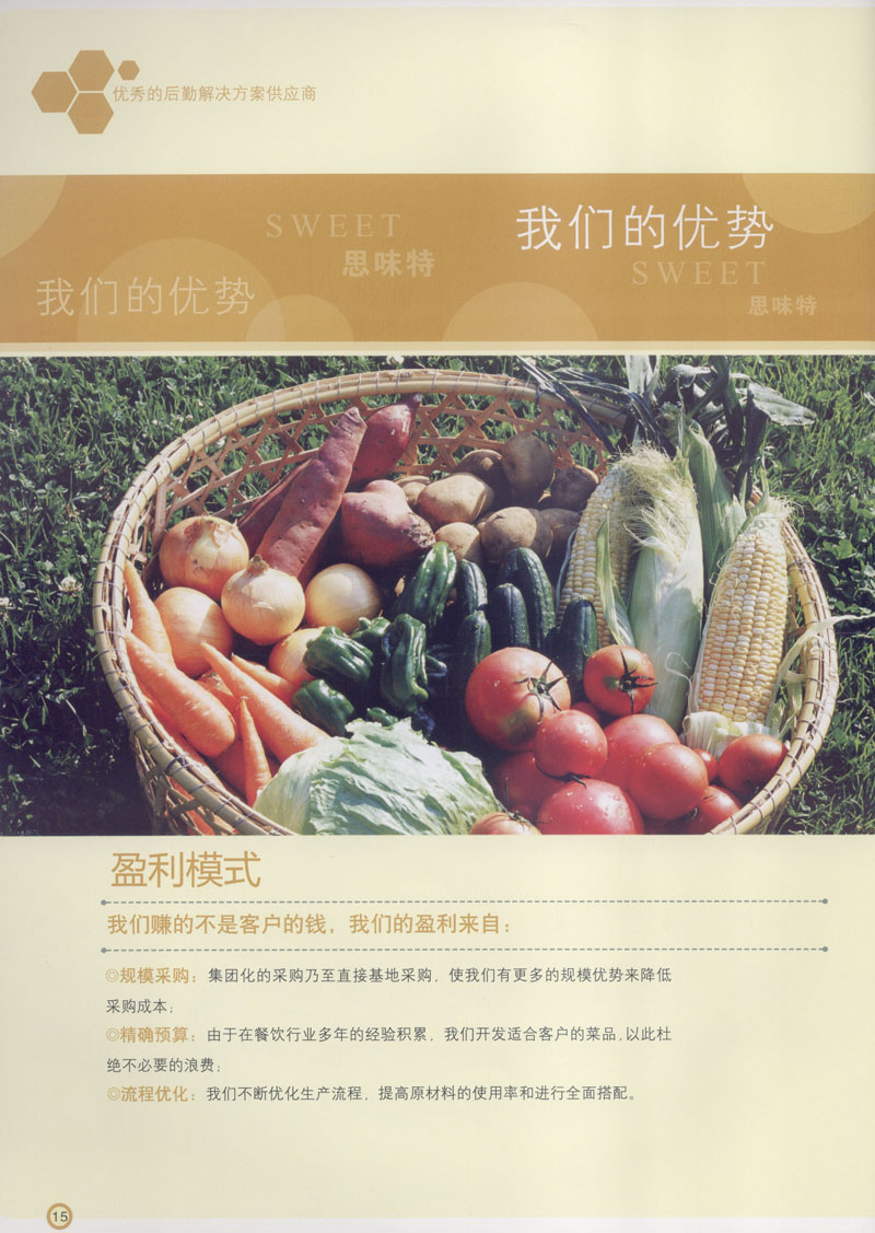 常州市思味特餐飲有限公司是一家專業(yè)從事企事業(yè)后勤服務(wù)的有限責(zé)任公司,公司從承包食堂起步,逐漸發(fā)展為經(jīng)營團膳承包、營養(yǎng)送餐、生活區(qū)管理、連鎖餐廳的綜合型企業(yè)。2008年公司斥資100萬元,在常州興建了可以同時提供3000餐膳食的中央廚房,重點打造“和美客”后勤服務(wù)品牌,全力為企事業(yè)單位解決后勤后顧之憂。 到目前為止,我們合作成功的企事業(yè)單位超過50多家,服務(wù)人數(shù)突破15萬,合作單位包括國家機關(guān)、國有企業(yè)、三資企業(yè)、民營企業(yè)、學(xué)校、醫(yī)院等,其中不乏國際知名品牌公司。 和美客愿為更多的國內(nèi)外企事業(yè)單位及機關(guān)團體分憂解難,從廚房設(shè)計、菜品配送、團膳承包、到生活區(qū)管理等提供全方位的服務(wù)。