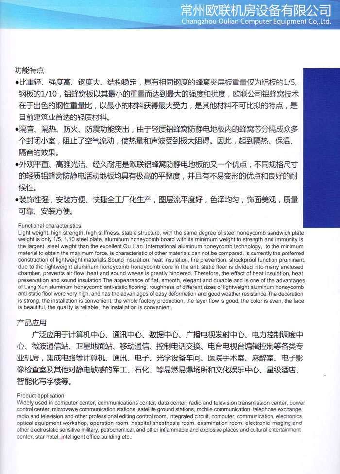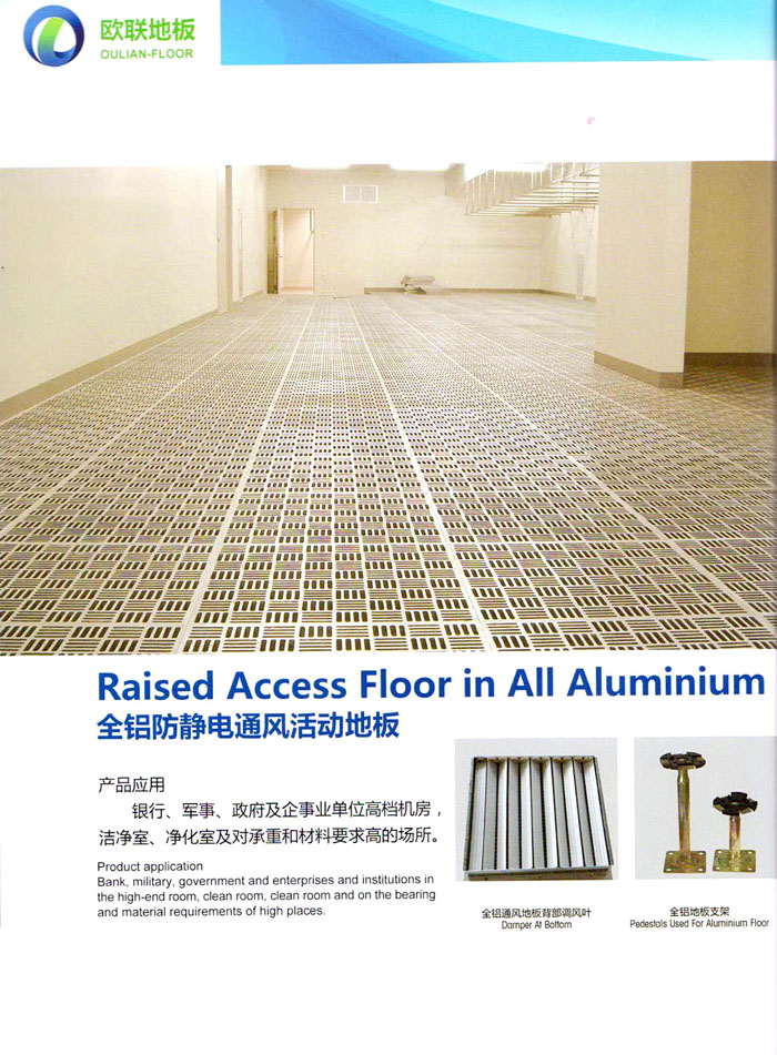 防靜電高架活動(dòng)地板、全鋼地板、陶瓷地板是計(jì)算機(jī)行業(yè)發(fā)展起來的新型鋪地材料,隔離了潮氣、靜電灰塵,最重要的是解決了綜合布線問題,無需預(yù)埋管線,可隨時(shí)拆卸、搬移,保證了資訊設(shè)備完整的優(yōu)點(diǎn),適應(yīng)了智能化樓宇中信息自動(dòng)化技術(shù)對(duì)所處環(huán)境的特定要求,避免了廣大客戶的雙重投資,使現(xiàn)代化辦公程度更加高效,辦公場(chǎng)所更加舒適。 “歐聯(lián)”系列全鋼地板,符合國(guó)家安全要求,種類完備多樣,其中防靜電陶瓷地板、硫酸鈣地板等除具有普通瓷質(zhì)的裝飾和實(shí)用性外,其耐磨、防水、防火功能優(yōu)于其它同類產(chǎn)品,防靜電系列地板,能切合不同客戶的要求,其靈活的配置,深受客戶歡迎,不同材質(zhì)的地板結(jié)構(gòu)使設(shè)計(jì)師的設(shè)計(jì)空間比傳統(tǒng)的更加廣闊自由和善變。 公司大力發(fā)展國(guó)內(nèi)外銷售業(yè)務(wù),多次中標(biāo)國(guó)內(nèi)重點(diǎn)工程 ,例:哈爾濱醫(yī)科大學(xué)、山東大學(xué)、上海普通機(jī)場(chǎng)等。 公司將一如既往開發(fā)和制造一流的產(chǎn)品,愿與廣大有識(shí)之士合作發(fā)展,共創(chuàng)美好未來。